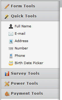 You have many different items to pick from to create your forms. Size, colors, fonts, there really isn't anything you can not custom design in these forms. Options you can work with include: FORM TOOLS, QUICK TOOLS, SURVEY TOOLS, POWER TOOLS, PAYMENT TOOLS.